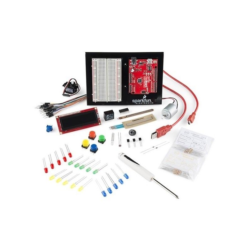 SparkFun Inventor's Kit (SIK) es una excelente manera de comenzar con la programación y la interacción de hardware con el lenguaje de programación Arduino. El SIK incluye todo lo que necesita para completar 16 circuitos que le enseñarán cómo leer sensores, mostrar información en una pantalla LCD, impulsar motores y más. No necesita ninguna experiencia previa en programación o electrónica para utilizar este kit.