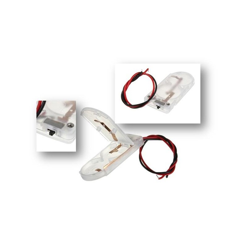 Este es un diseño compacto para la pila botón, de tamaño muy reducido, casi plano para colocar en cualquier lugar no visible con salida de dos cables desnudos par conexión, de distinto color: para diferencial el positivo (+) cable color rojo del Negativo (-) cable color negro, de 15 cm cada uno.