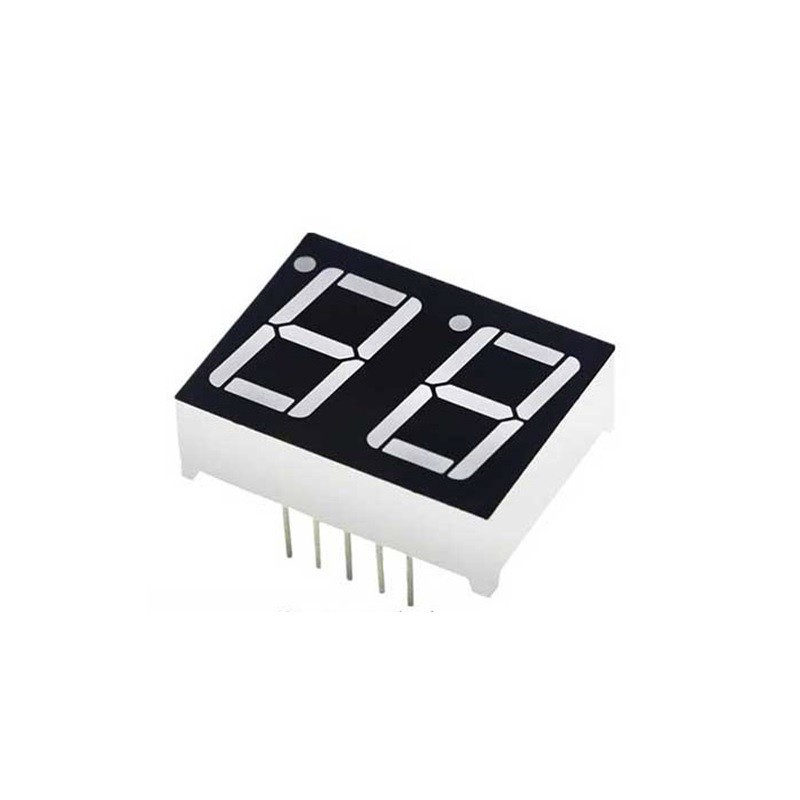 Un display LED de 7 segmentos y 2 dígitos de 0.56" con cátodo común es un componente electrónico que se utiliza comúnmente para mostrar números en dispositivos electrónicos como relojes, cronómetros, temporizadores, etc. Cada dígito consta de siete segmentos individuales que pueden encenderse o apagarse para representar números del 0 al 9.