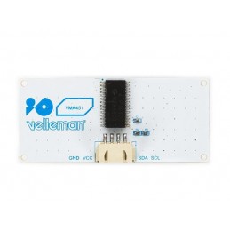La matriz de LEDs VMA451 (8x16), lleva 128 LEDs,de 4mm, un chip AIP1640 (parte trasera) y un conector macho de 4 pines para GND, VCC, SDA y SCL.