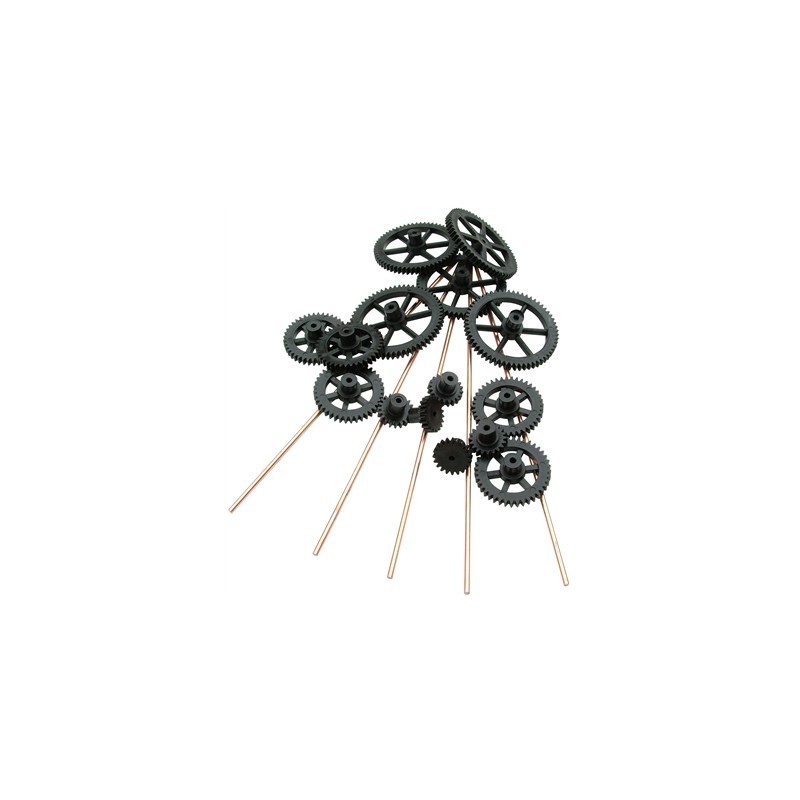 Surtido de engranajes miniatura de alta calidad, fabricados en Inglaterra con nylon. Se encastan en presión en ejes de diámetro 2 mm. (incluidos).