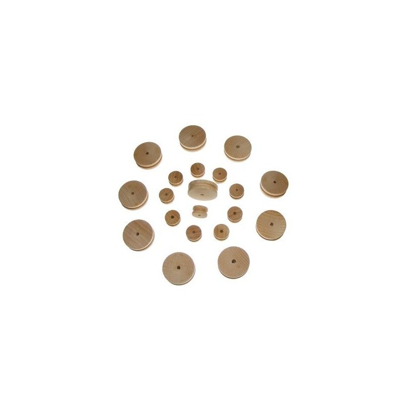Poleas de madera 20 Uds. diámetros 15/12 y 30/26 - eje de 3 mm