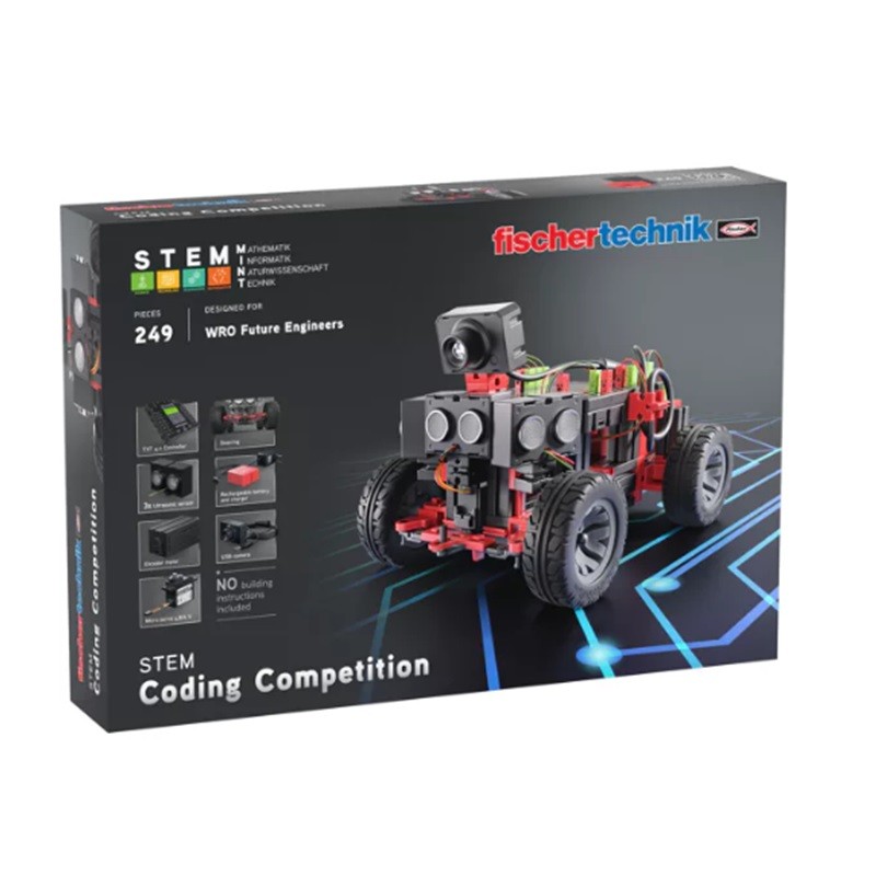 El nuevo fischertechnik STEM Coding Competition viene con todo lo necesario para construir y programar un coche robot de conducción autónoma y dominar con éxito un curso. El kit para un chasis de conducción autónoma incluye el potente controlador TXT 4.0, tres sensores ultrasónicos, un potente motor codificador, una cámara, un engranaje diferencial, dirección Ackermann con servomotor incluido, así como una batería y una fuente de alimentación. El conjunto es ideal para participar en competiciones de robótica como la WRO.