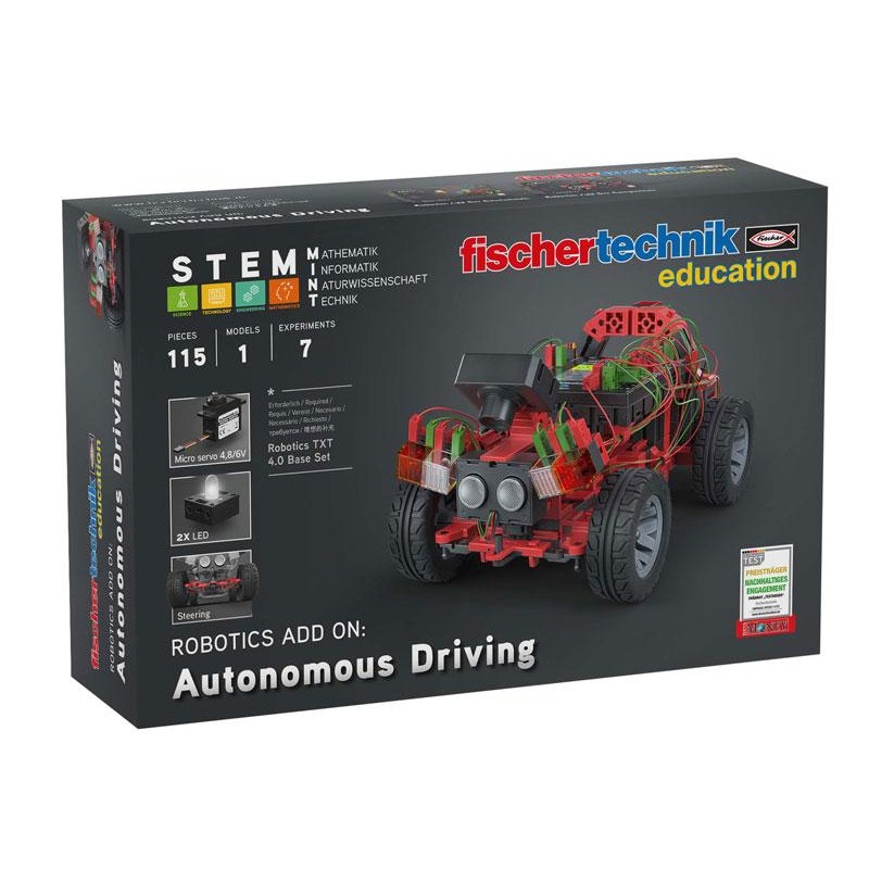 Construir y programar el vehículo del futuro: ¡una tarea totalmente especial en clase! El Robotics Add On: Autonomous Driving ofrece, junto con el Robotics Base Set, la posibilidad de descubrir muchas tecnologías fascinantes que casi todo el mundo conoce a través de su día a día. Desde las luces automáticas, pasando por un sistema de aviso de salida de carril, un control de velocidad hasta un sistema automático de aparcamiento: el modelo fascinará en el aula. El kit de construcción incluye, además de un diferencial, más ruedas, LED y un servomotor para la dirección. El Robotics Add On: Autonomous Driving se complementa con el material de enseñanza, que incluye 7 experimentos con sus respectivas soluciones.