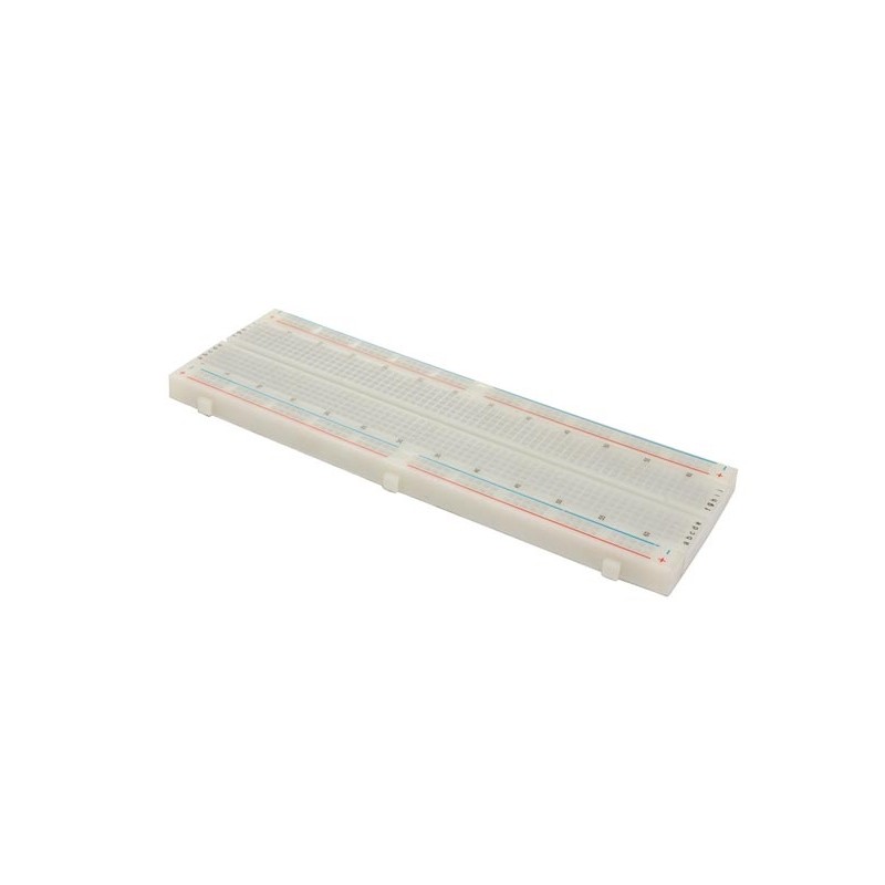 Protoboard dividida en 2 columnas de 5 x 63 contactos a su vez separadas en su parte central por un canal de 2 mm.