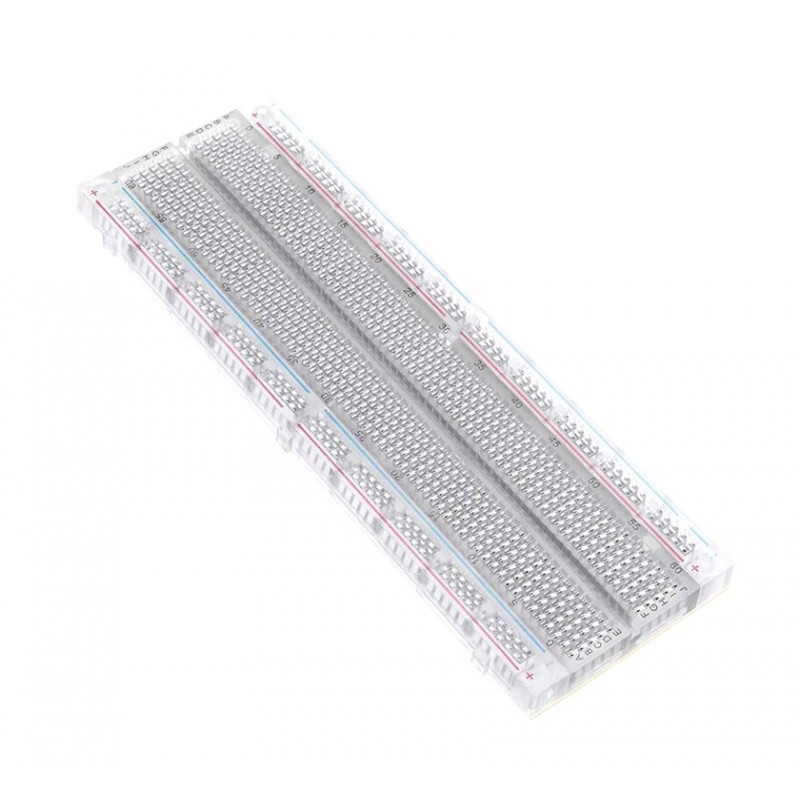 Protoboard dividida en 2 columnas de 5 x 63 contactos a su vez separadas en su parte central por un canal de 2 mm.