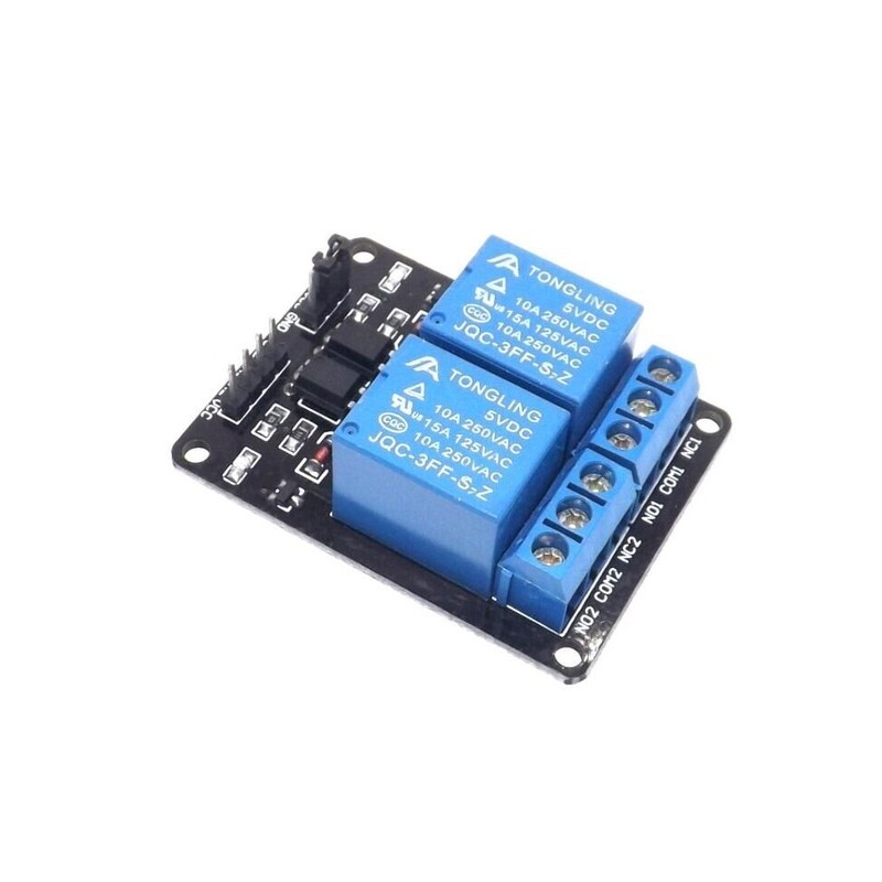 Puedes alimentar el módulo en los pines VCC y GND con 5VDC directamente desde tu placa Arduino y tienes disponibles los pines IN1 e IN2, para controlar los dos relés. Un nivel bajo conmutará el relé correspondiente.