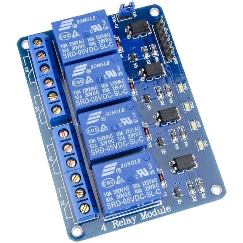 Tarjeta de relés acoplados, incluye 4 canales para ser controlados en forma remota. Ideal para controlar dispositivos en el hogar o en la industria. Cada canal es controlado por una entrada TTL, la cual puede ser fácilmente controlada por una placa Arduino.